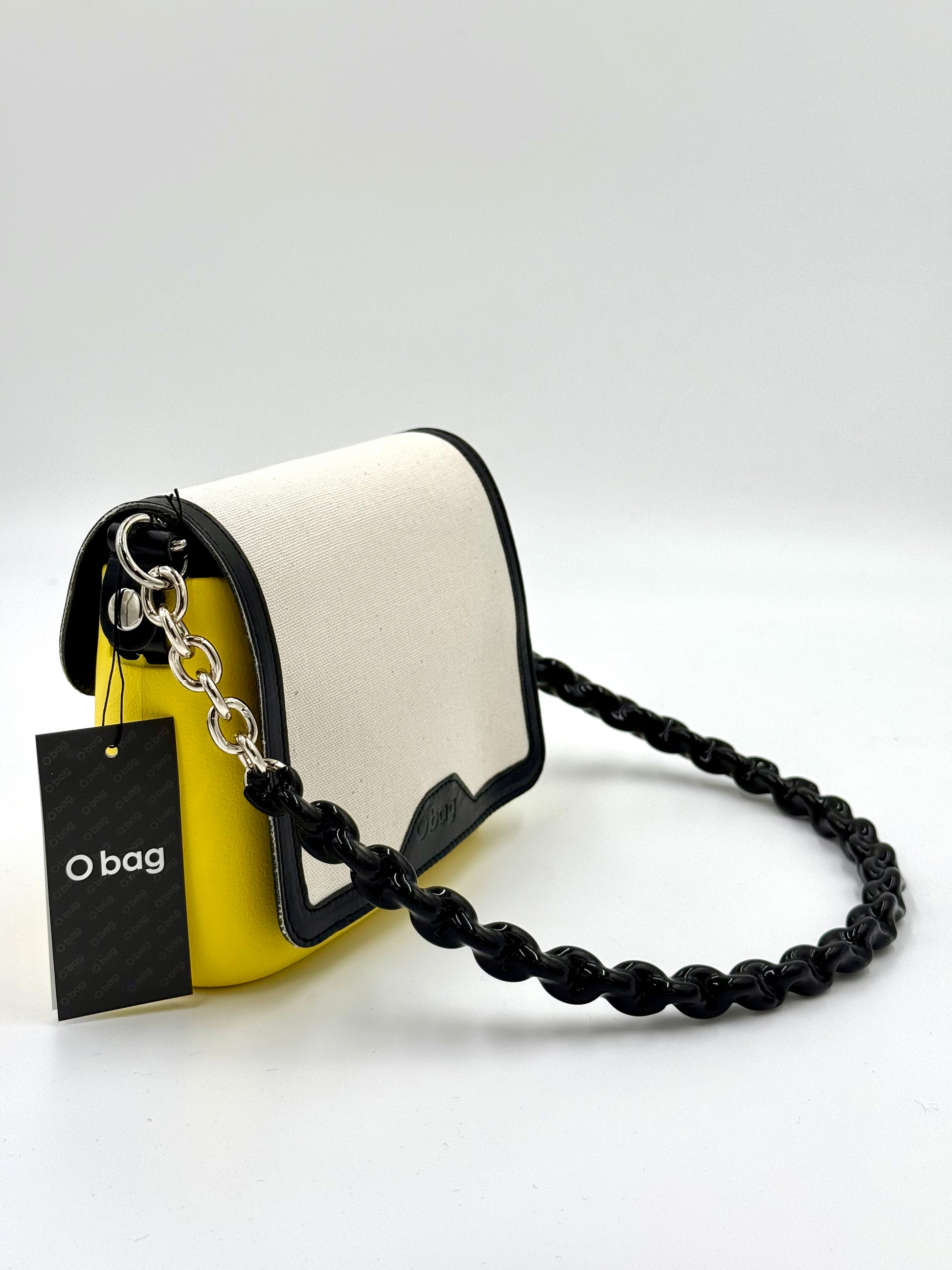 O bag Pocket mini bag – lemon yellow body, white lid, black chain strap