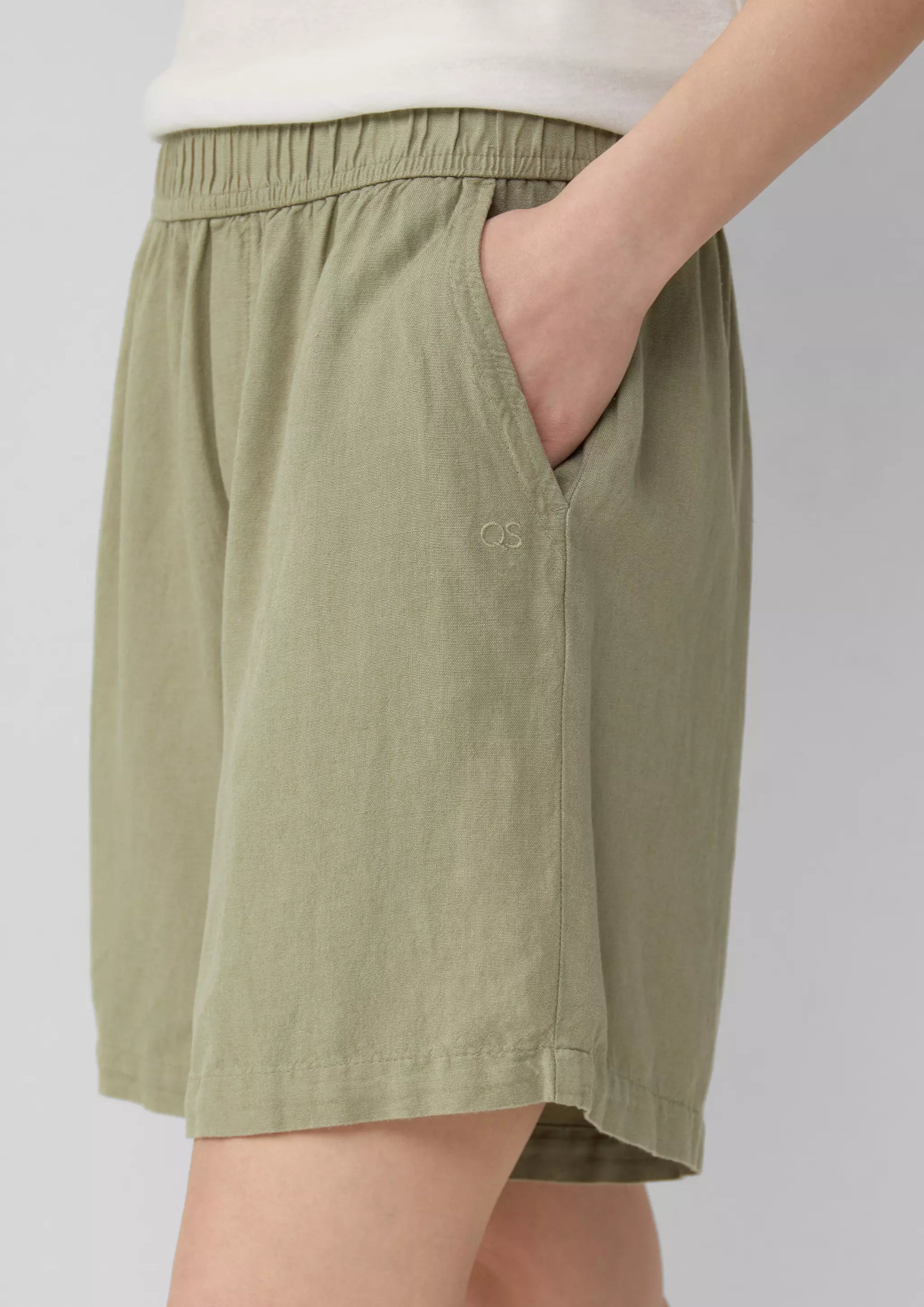 Woman wearing Q/S s.Oliver olive green linen shorts outdoors