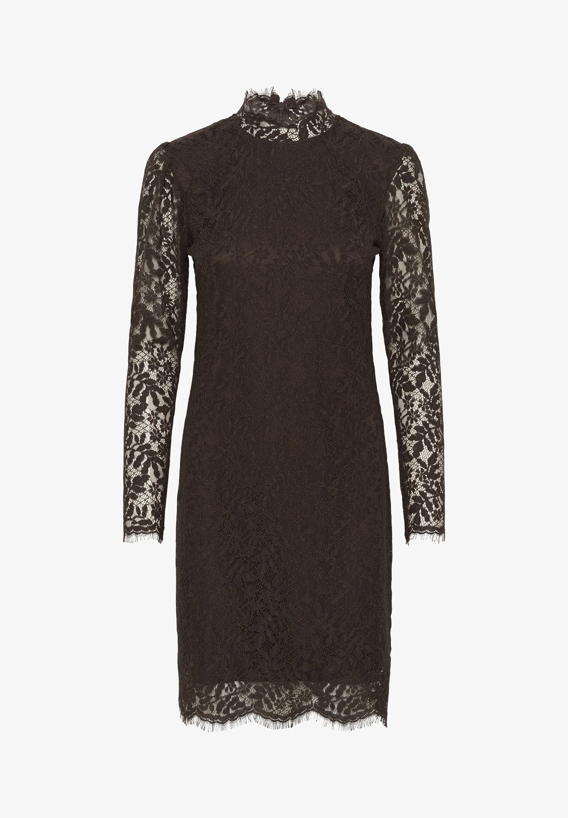 Make an unforgettable impression with the Saint Tropez GannaSZ lace dress in sophisticated oak brown. This stunning piece features an intricate floral lace overlay throughout, with a high mock neckline adorned with delicate scalloped trim and long sheer lace sleeves that add romantic allure. The fitted silhouette with a knee-length hem and scalloped lace trim creates a flattering, feminine shape. Fully lined for comfort and modesty, this dress combines vintage-inspired elegance with contemporary sophistication in a warm, versatile oak brown hue.