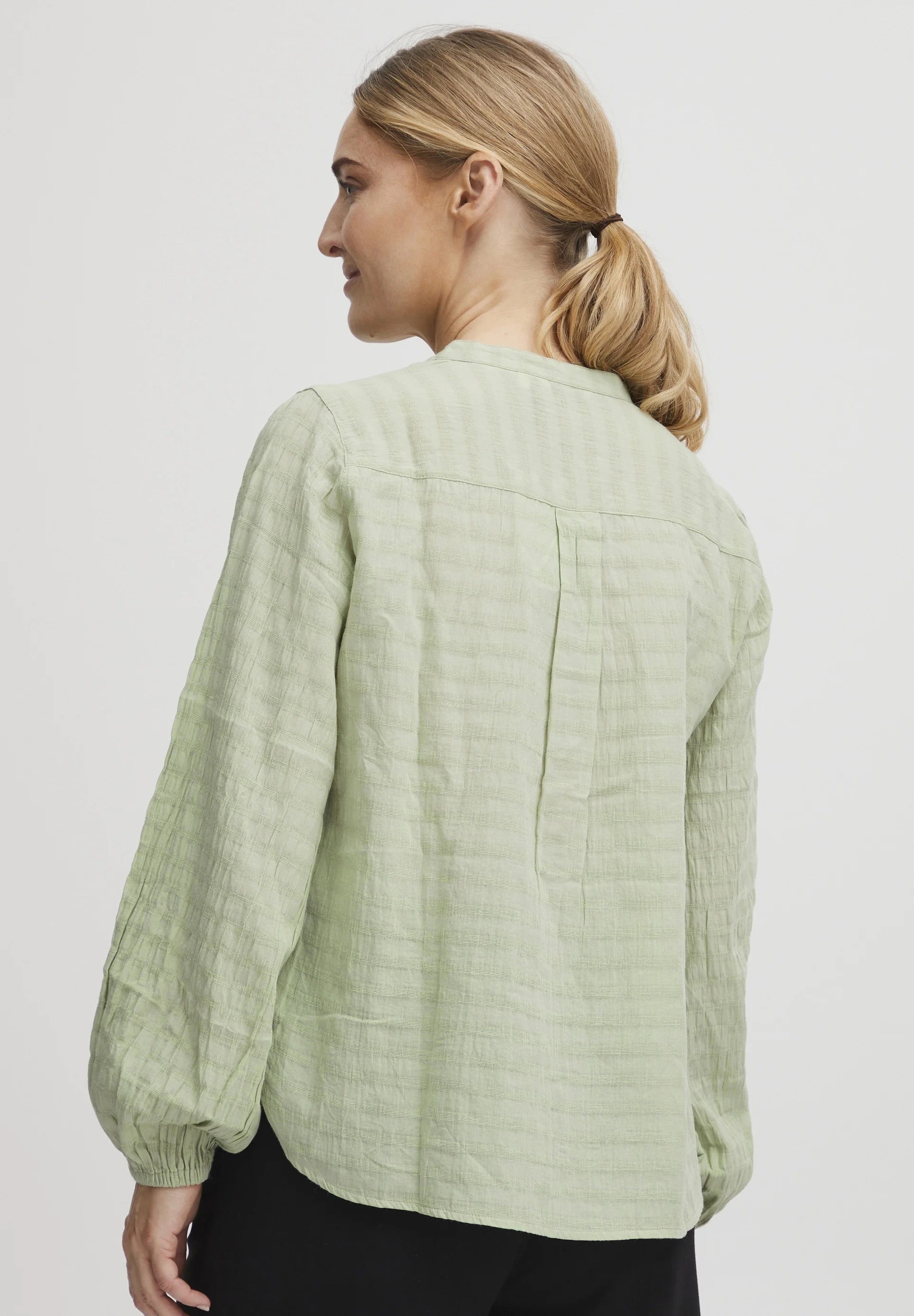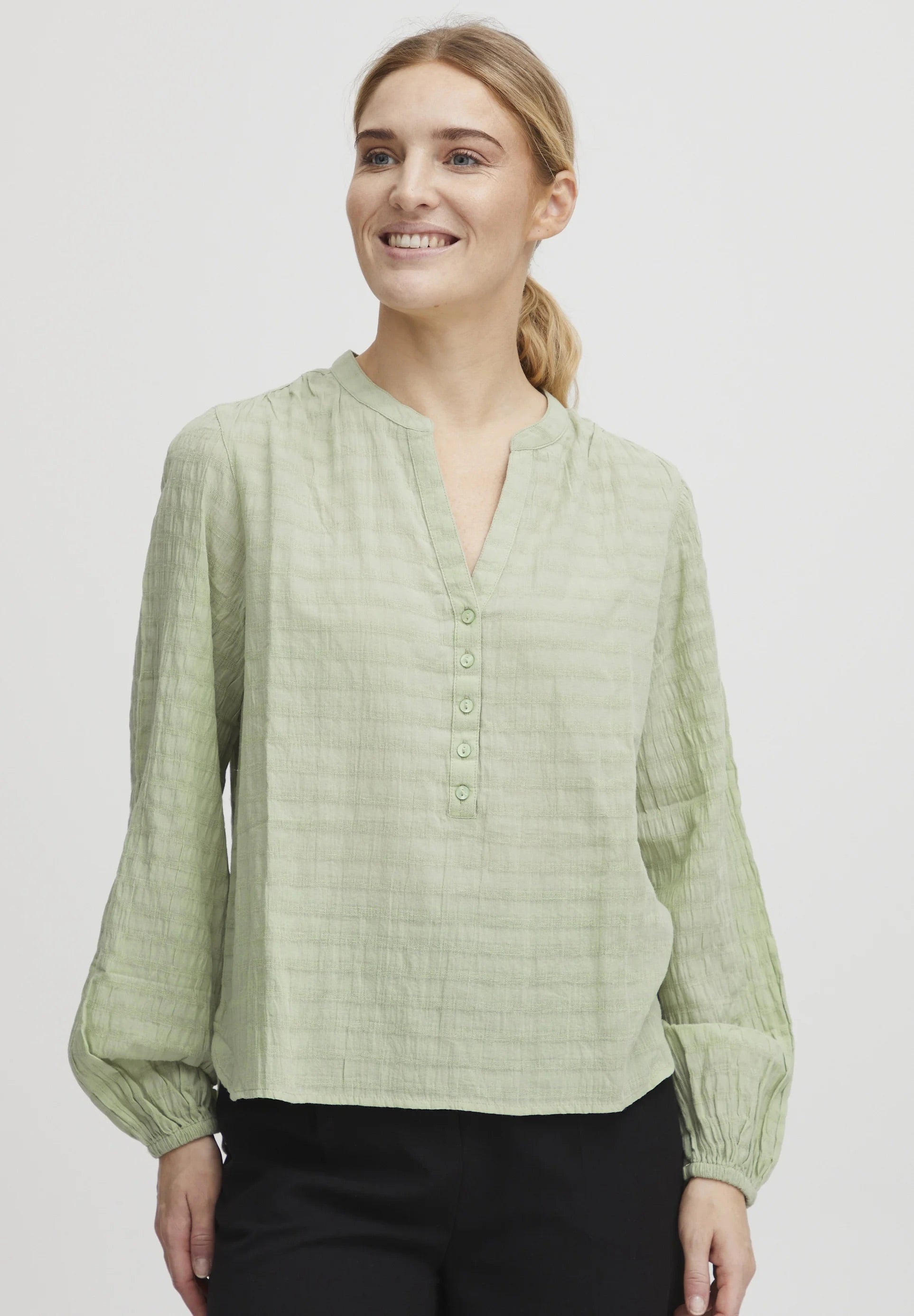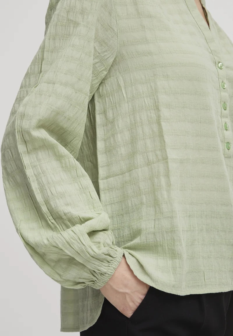 Öleld magadhoz a visszafogott eleganciát a b.young BYIloni texturált jacquard blúzzal füstzöld színben.
