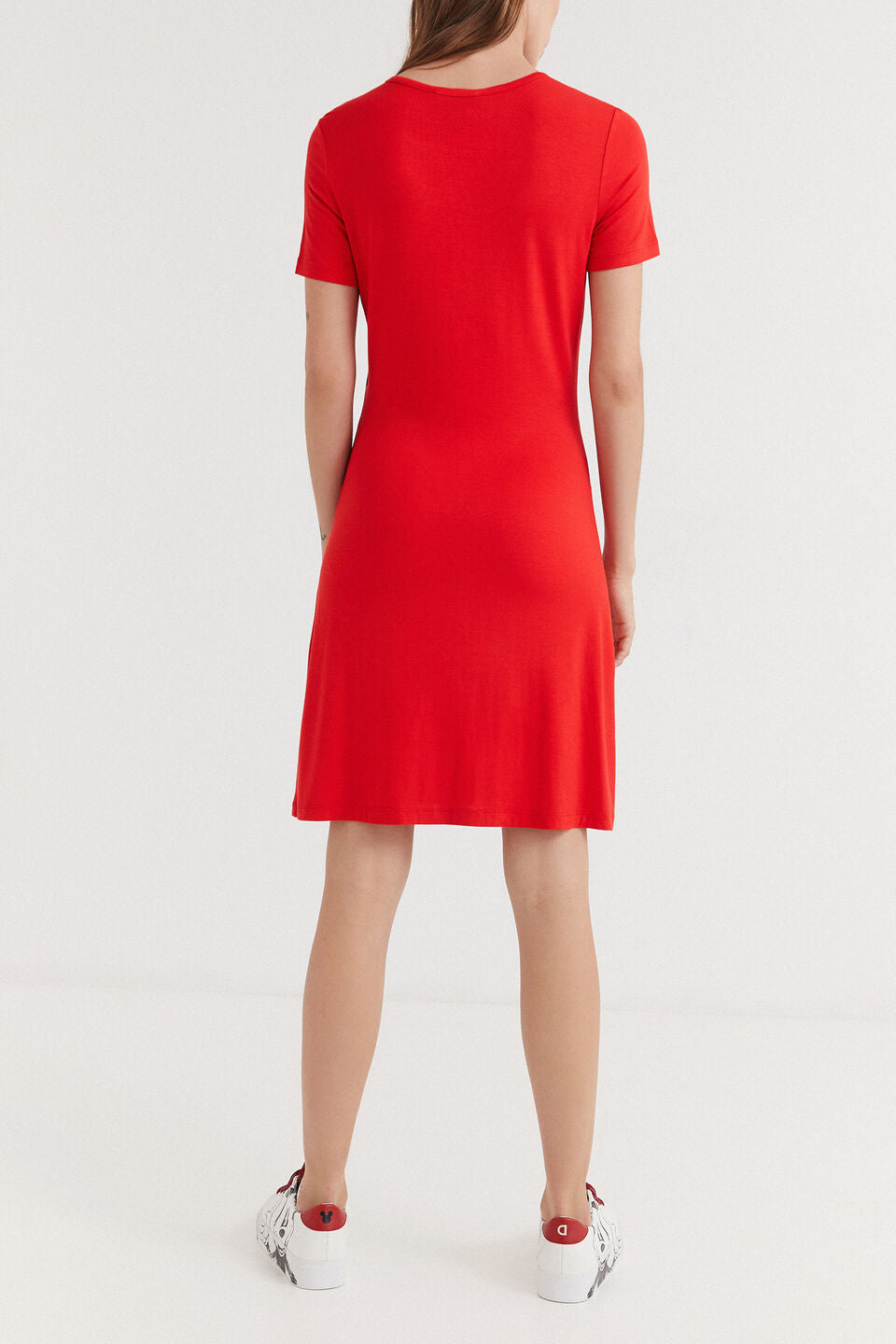 Rövid ujjú, egyenes vonalú Desigual pólóruha élénk piros színben, elején nagy, vagány Mickey egér grafikával. Puha, rugalmas anyaga kényelmesen követi az alakot, a klasszikus kerek nyakkivágás és a térd fölé érő hossz pedig laza, sportos megjelenést ad. Ideális választás hétköznapokra, városi sétához vagy utazáshoz – elég hozzá egy fehér sportcipő és egy kis táska, és máris kész a vidám, játékos szett.