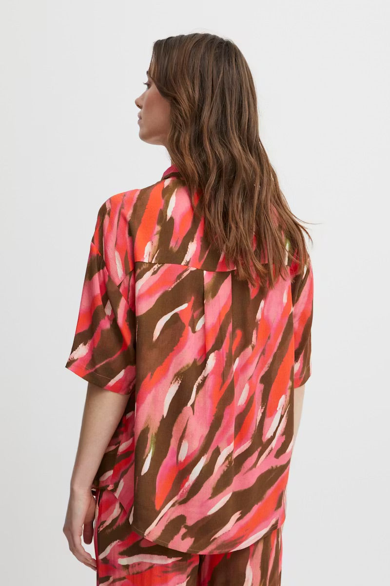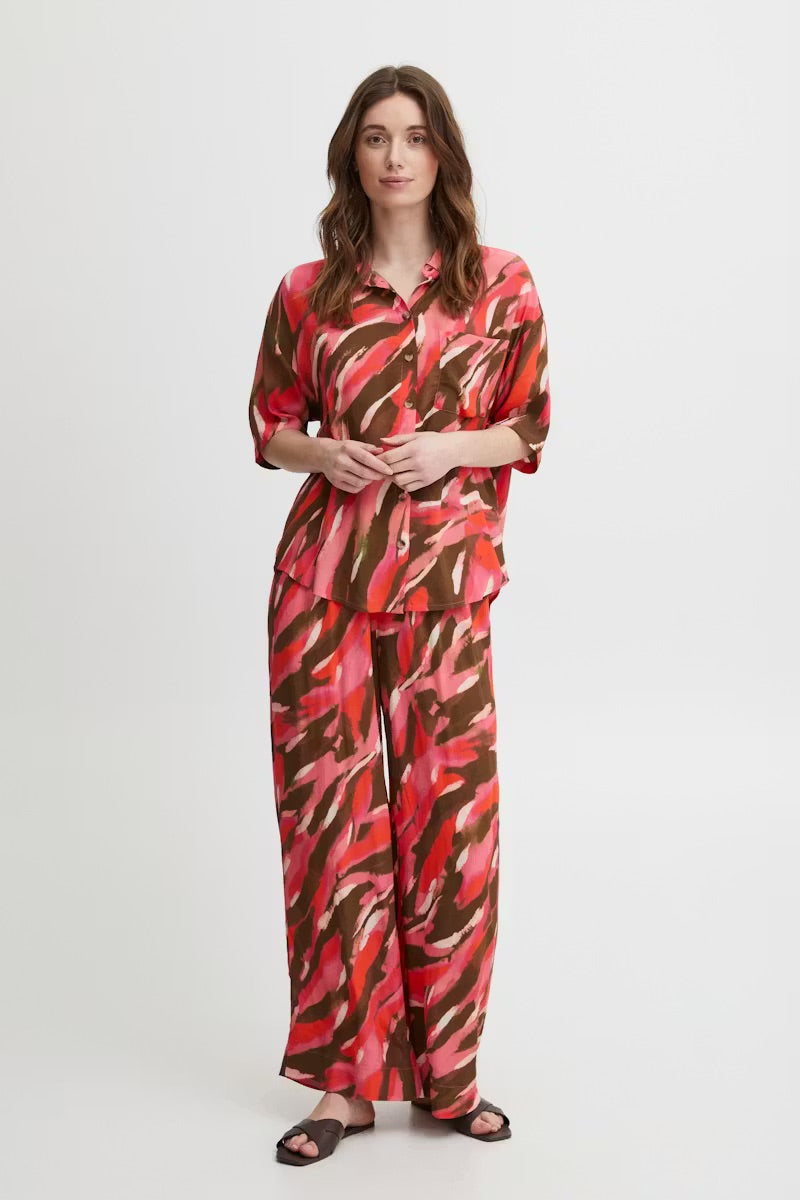 Légy merész a Fransa FRKAIYA Skjorta inggel, élénk, absztrakt mintával . Ez a dán tervezésű darab szemet gyönyörködtető ecsetvonás-mintával rendelkezik korallrózsaszín, csokoládébarna és krémszínű árnyalatokban, kortárs, művészi megjelenést kölcsönözve, amely egyszerre kifinomult és játékos.