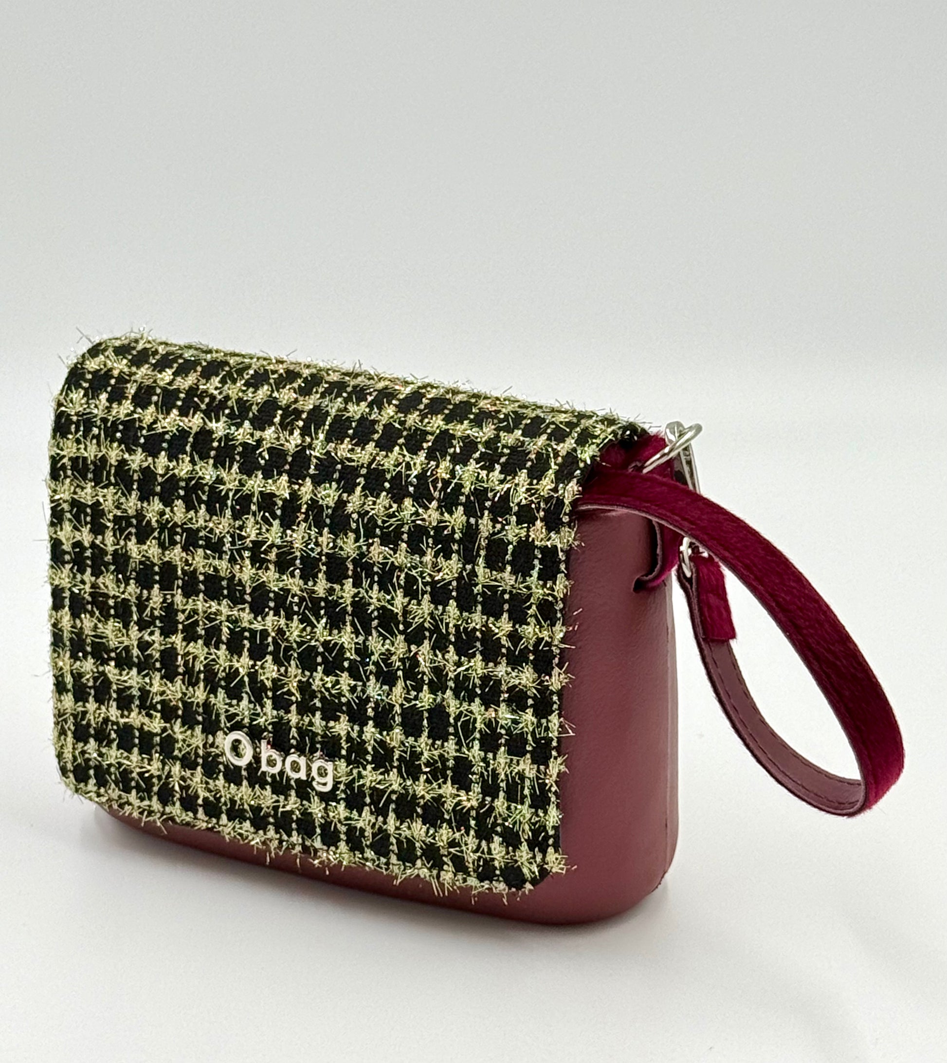 Stílusos, kompakt kiegészítő a mindennapokra: ez az O pocket mályva színű táskatesttel és különleges, fekete–zöld tweed/kockás hatású fedlappal készült, finoman csillanó szálakkal. A hozzá illő mályva vállpánt kényelmes hordást ad, így tökéletes választás telefonhoz, kártyákhoz, kulcsokhoz és apróságokhoz – amikor csak a legszükségesebbeket vinnéd magaddal.