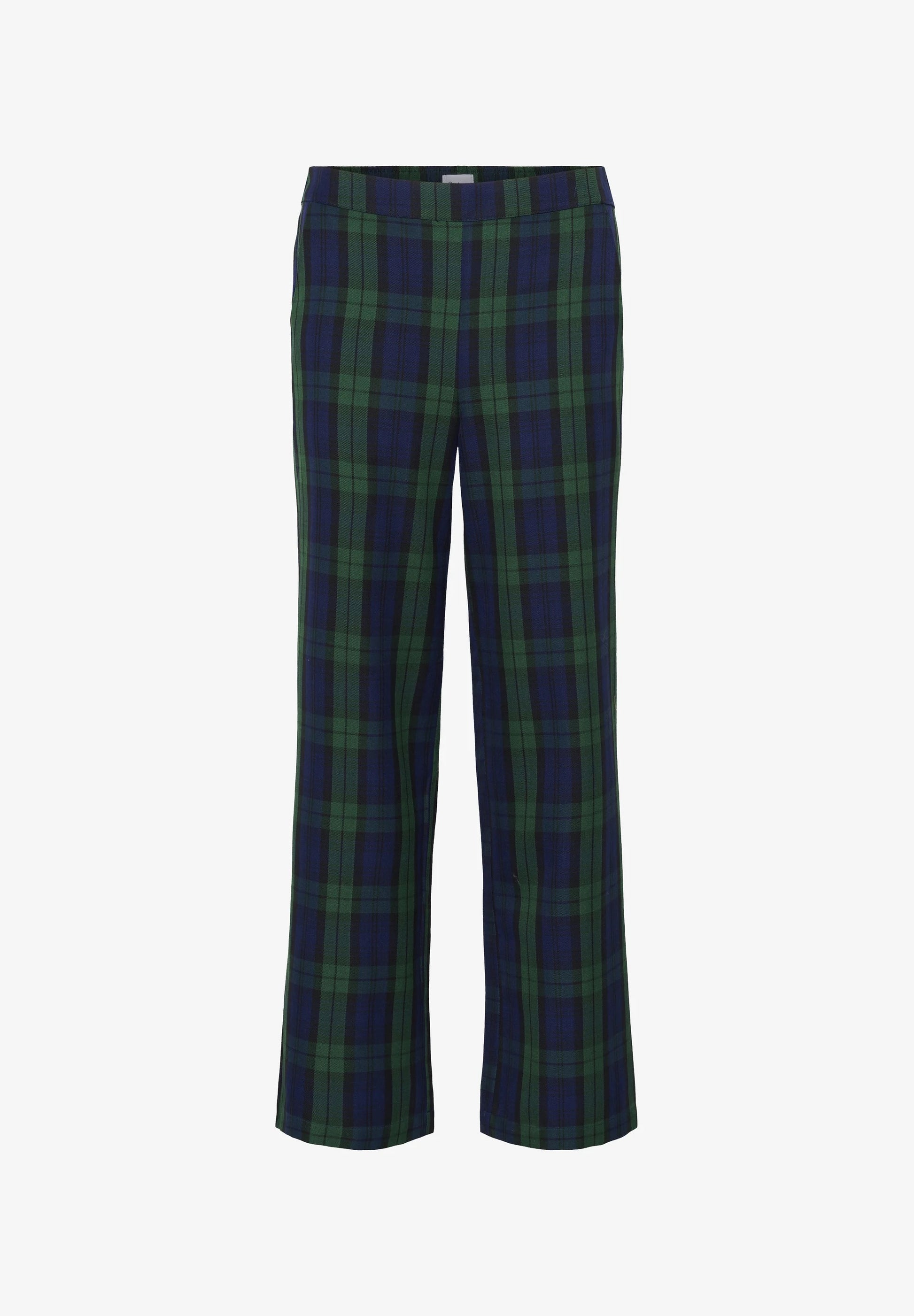 Gazdag zöld és sötétkék kockás mintával, finom fekete díszítéssel, ezek a bő szárú nadrágok előnyös, áramló sziluettet kínálnak, amely gyönyörűen mozog. A magas derekú, gumírozott derékpánttal ellátott kialakítás egész napos kényelmet biztosít, míg a funkcionális oldalsó zsebek praktikus eleganciát kölcsönöznek. A laza szabás és a teljes hosszúságú szabás nyújtó hatást kelt, így tökéletes mind professzionális, mind hétköznapi alkalmakra. Prémium minőségű, kiváló drapériájú anyagból készült, ezek a nadrágok megőrzik alakjukat, miközben kényelmes mozgást biztosítanak.